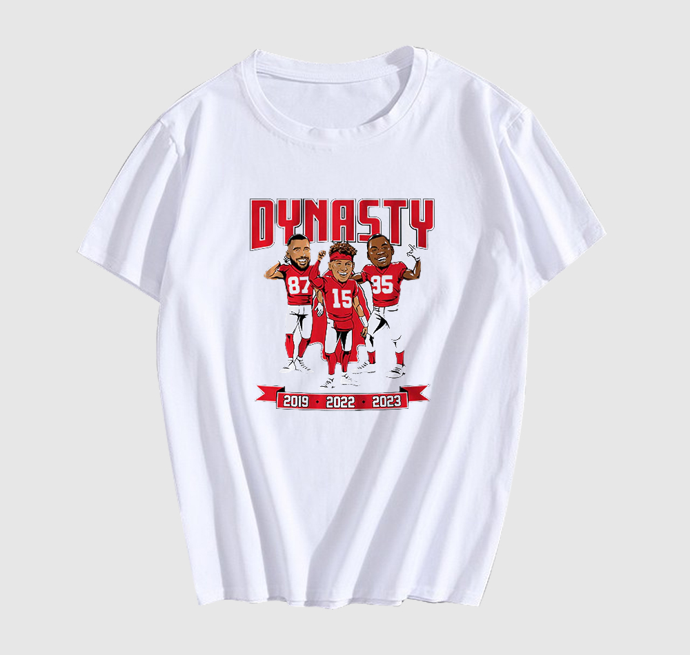 We use newest DTG Technology to print on to CHIEFS 2023 WORLD CHAMPS DYNASTY CARICATURES T SHIRT.