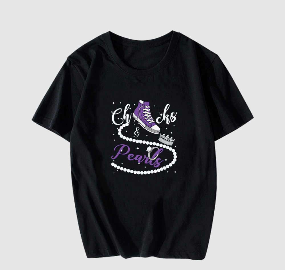 We use newest DTG Technology to print on to Chucks and Pearls T Shirt