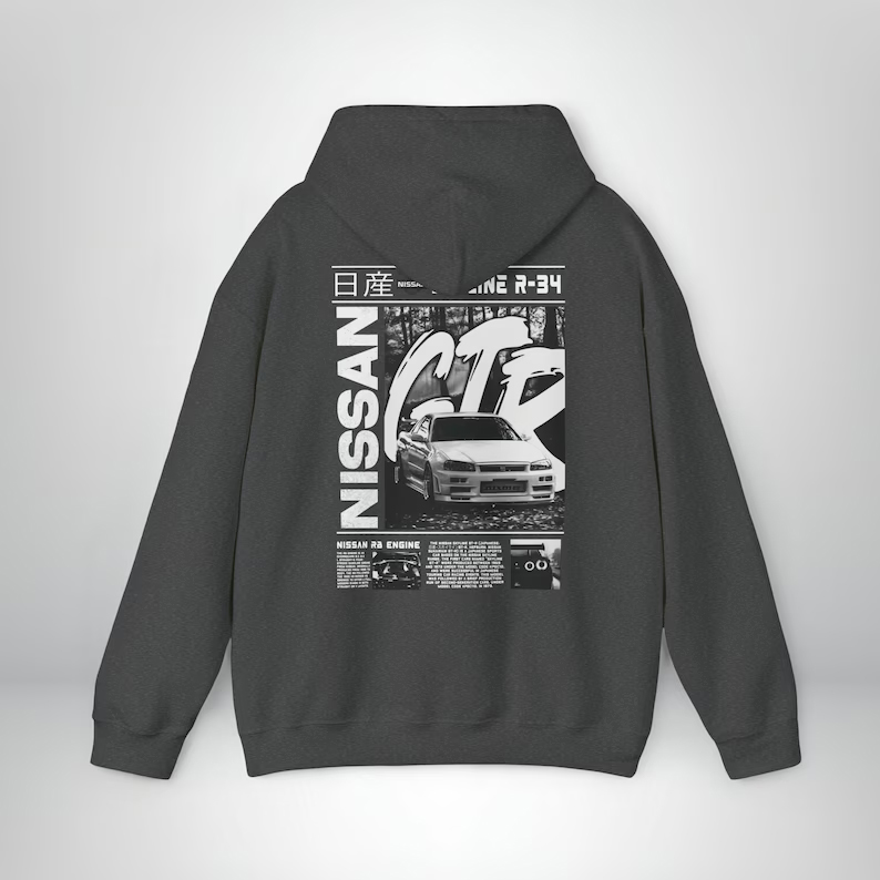 We use newest DTG Technology to print on to Nissan Skline R34 Hoodie.